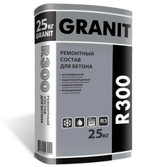 Ремонтный состав для бетона GRANIT R300 изготовлен на основе  цемента, фракционированного кварцевого песка, минерального  наполнителя, комплекса полимерных и модифицирующих добавок с добавлением  стеклофибры. Безусадочная, гидрофобная,    армированная смесь марки М300....